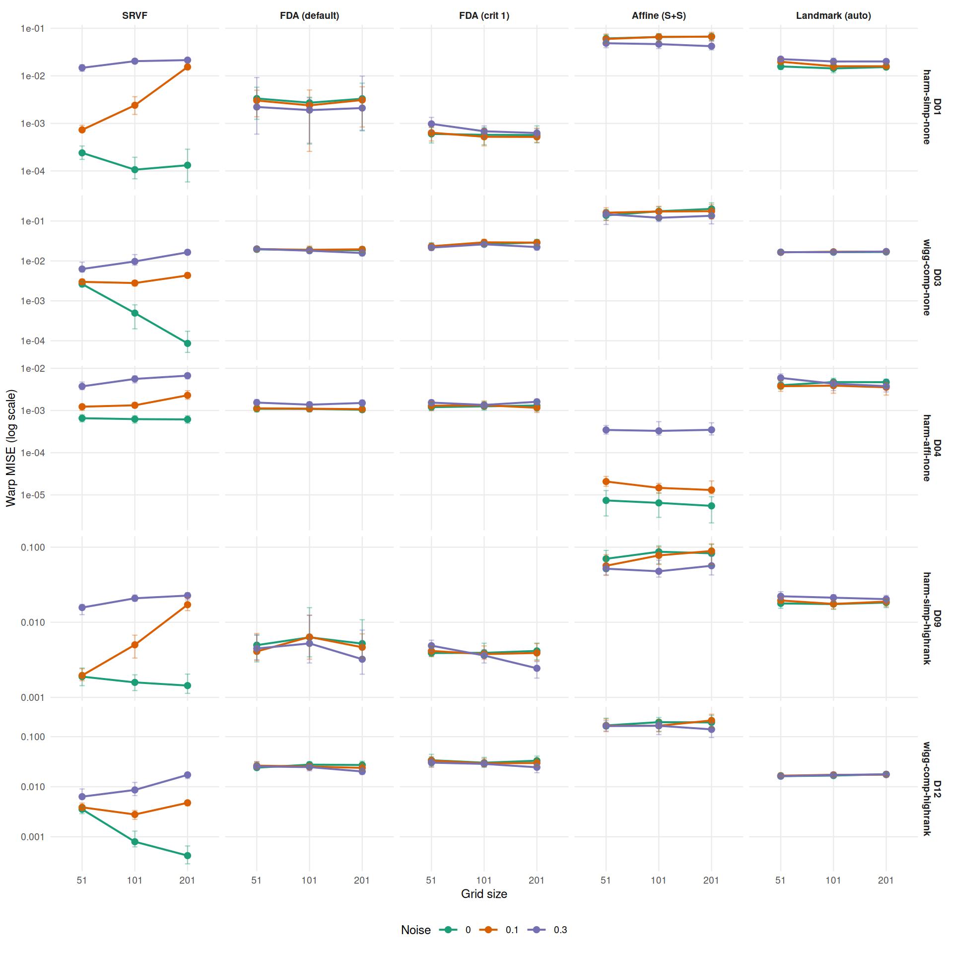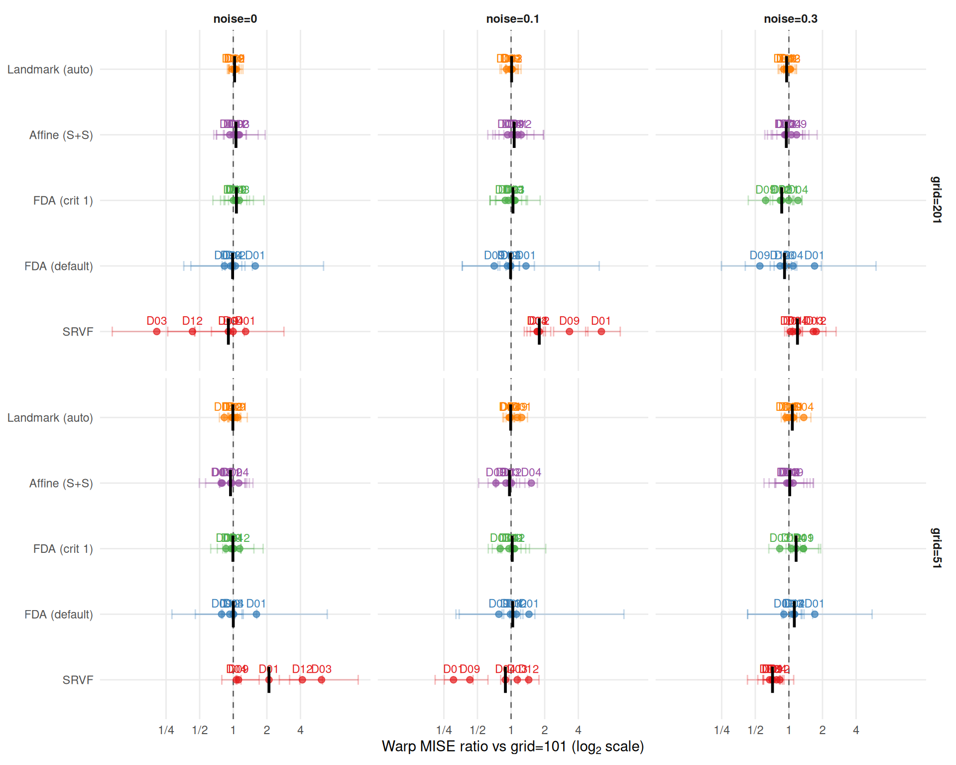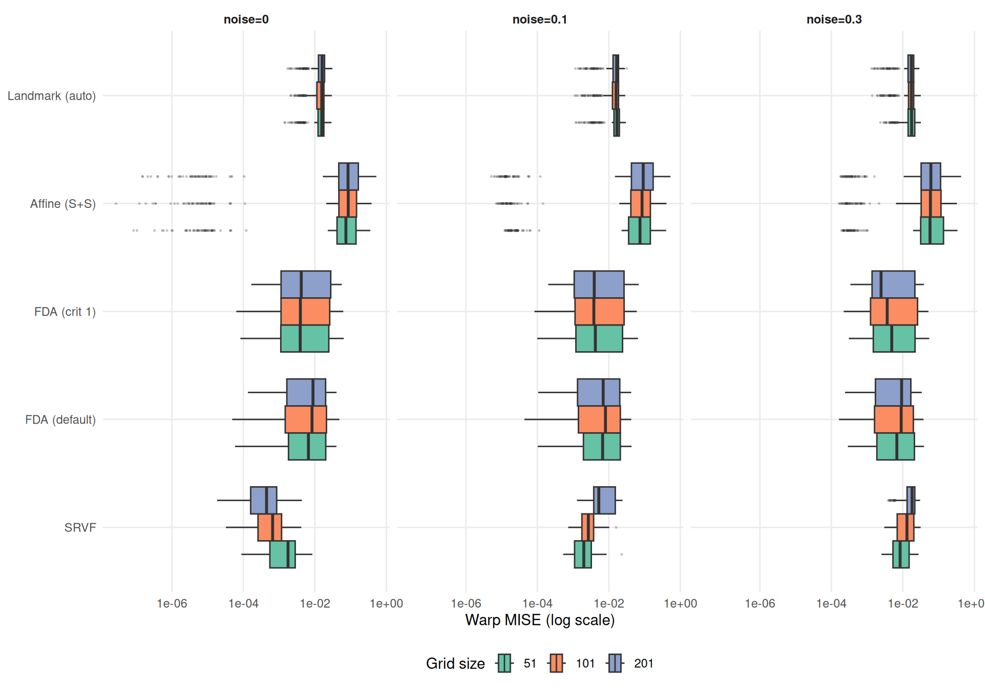 cat("**Median warp MISE ratio vs grid=101** (by method and noise level):\n\n")Median warp MISE ratio vs grid=101 (by method and noise level):