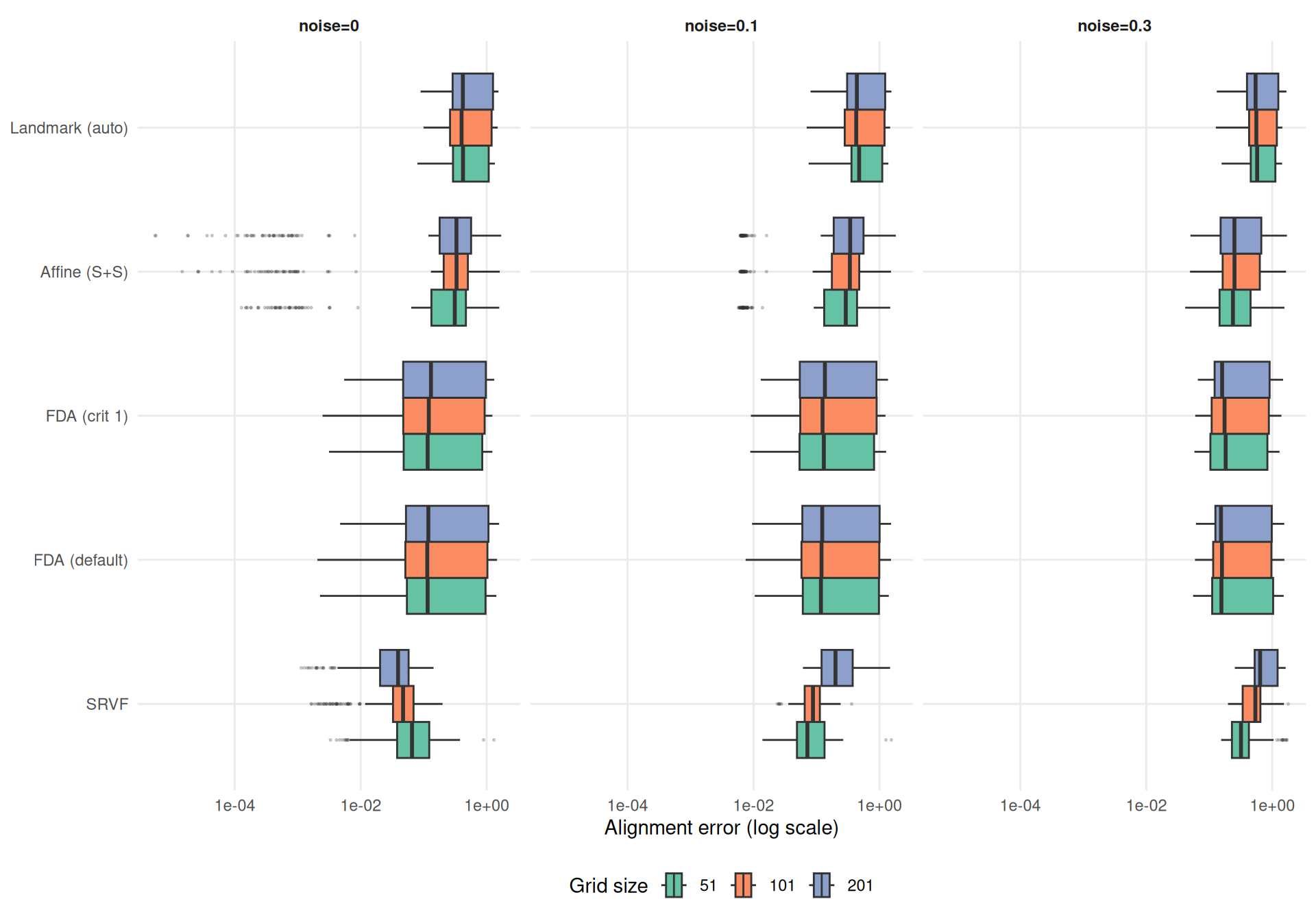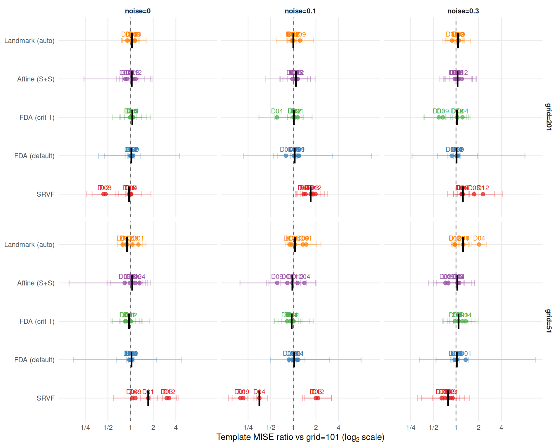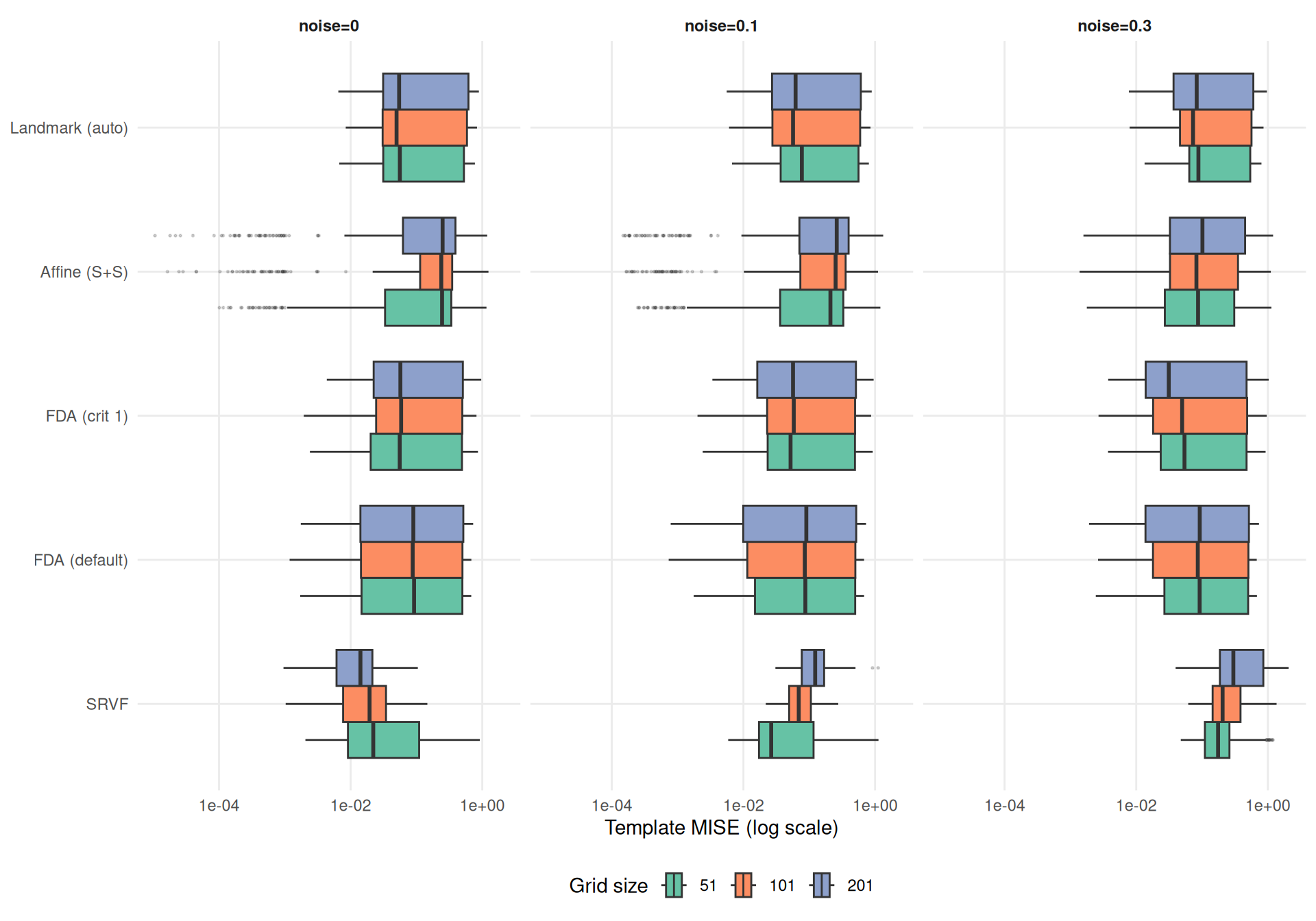 cat("**Median warp MISE ratio vs grid=101** (by method and noise level):\n\n")Median warp MISE ratio vs grid=101 (by method and noise level):