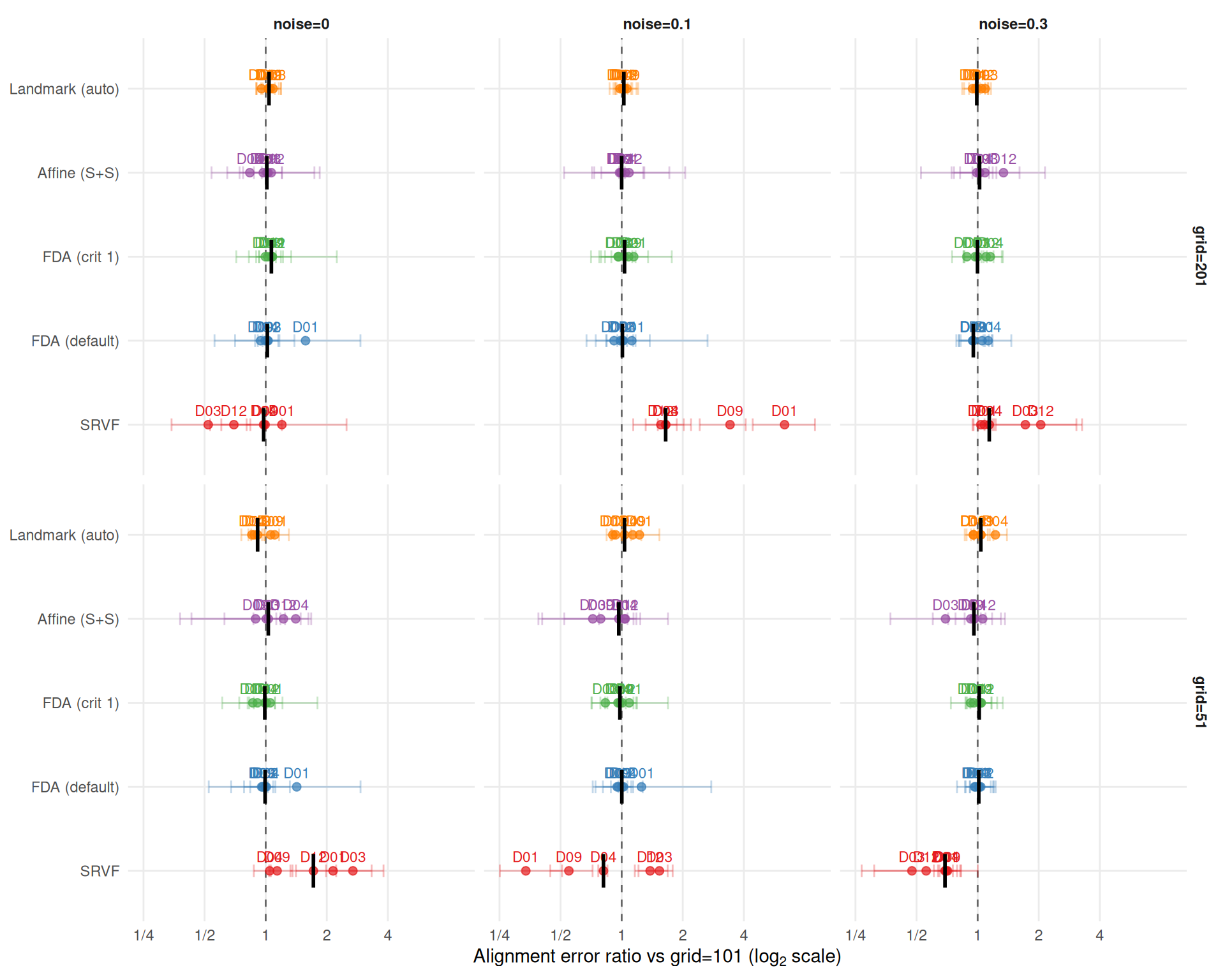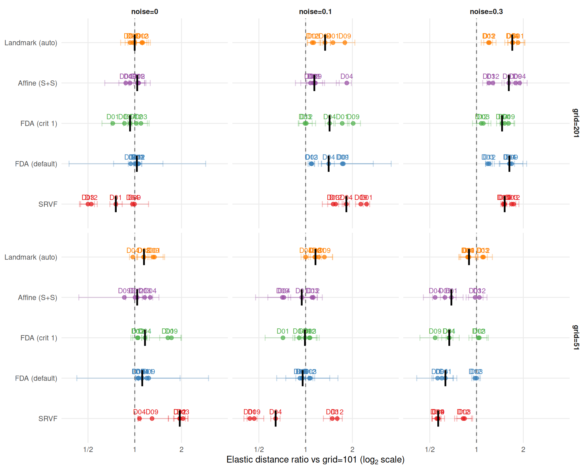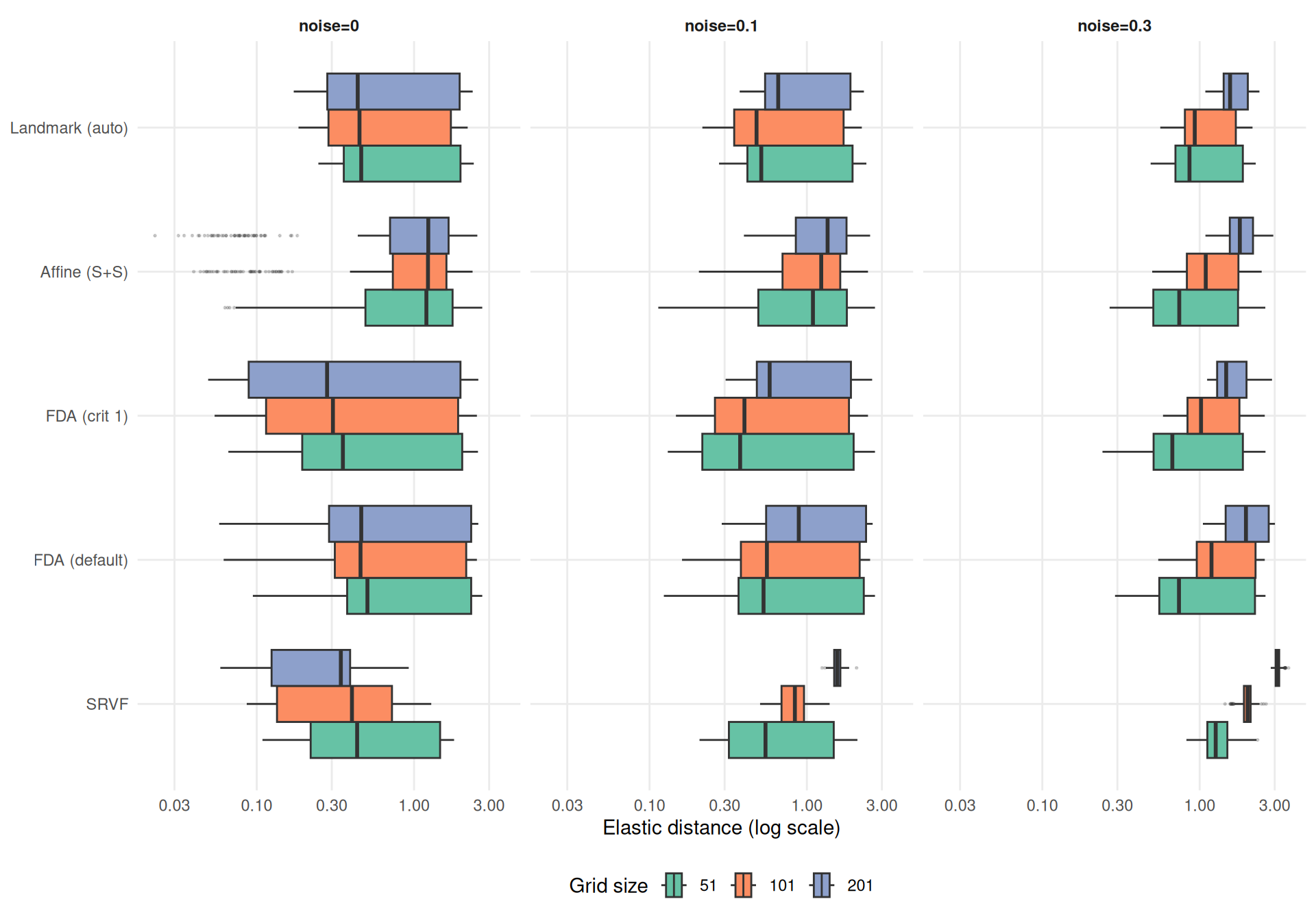 cat("**Key finding: SRVF grid sensitivity reverses with noise level.**\n\n")Key finding: SRVF grid sensitivity reverses with noise level.