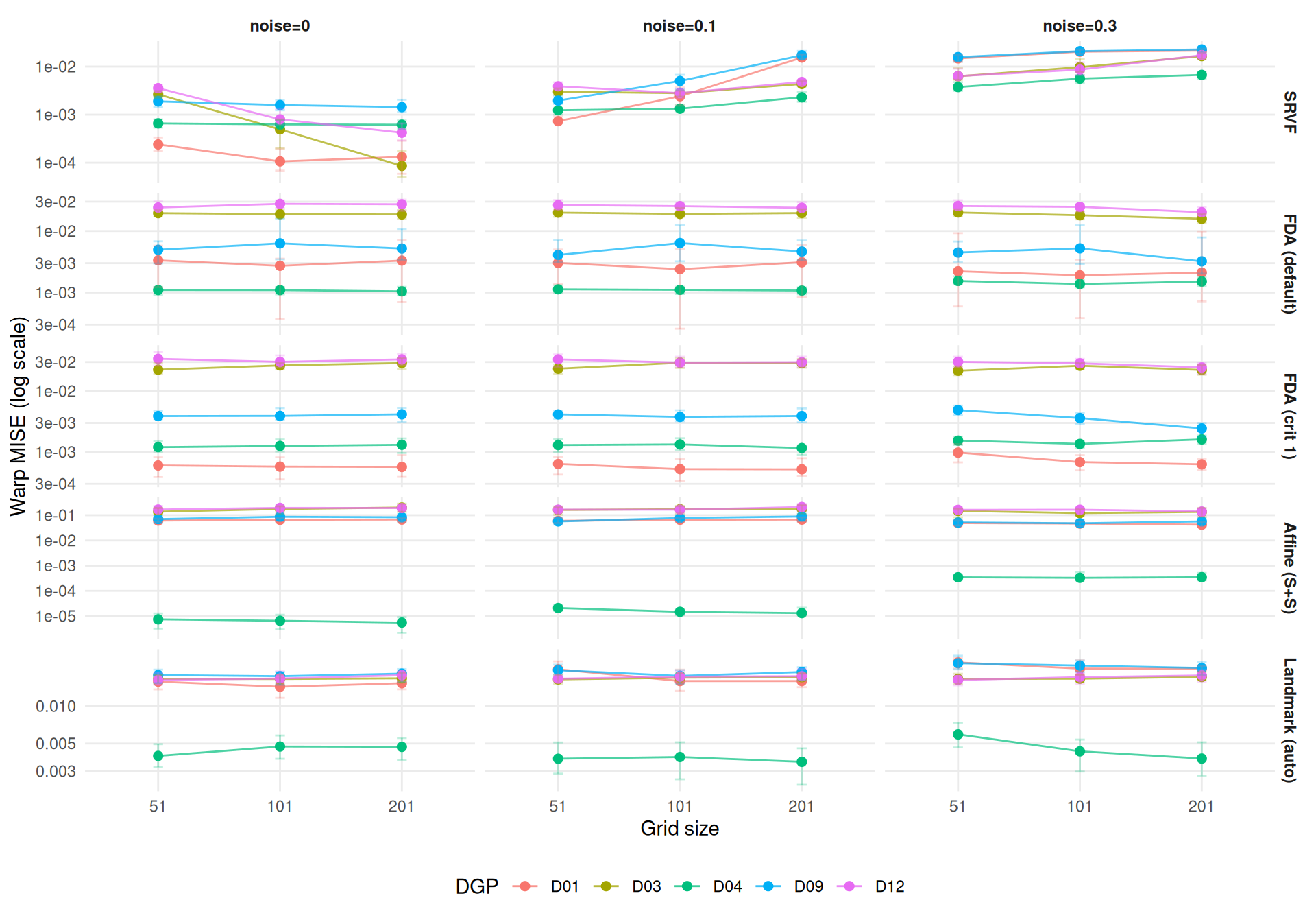 labs(x = "Grid size", y = "Warp MISE (log scale)") +