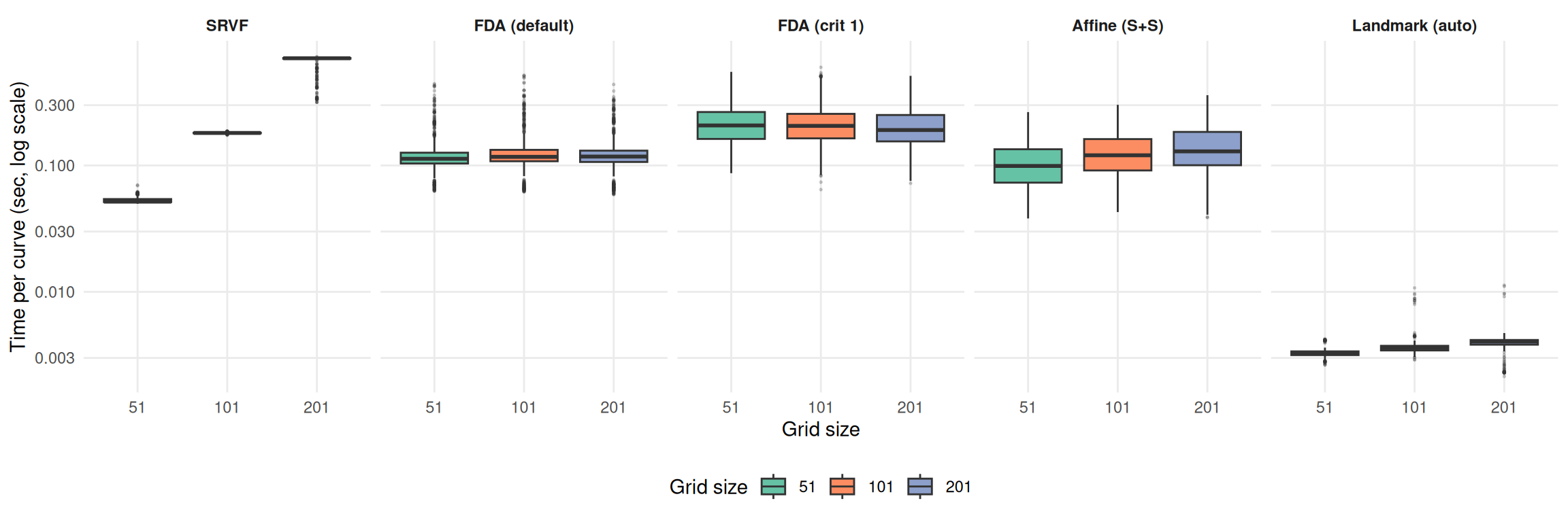 labs(x = "Grid size", y = "Time per curve (sec, log scale)") +