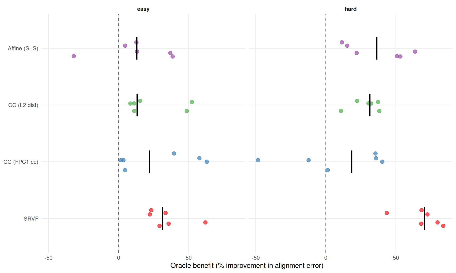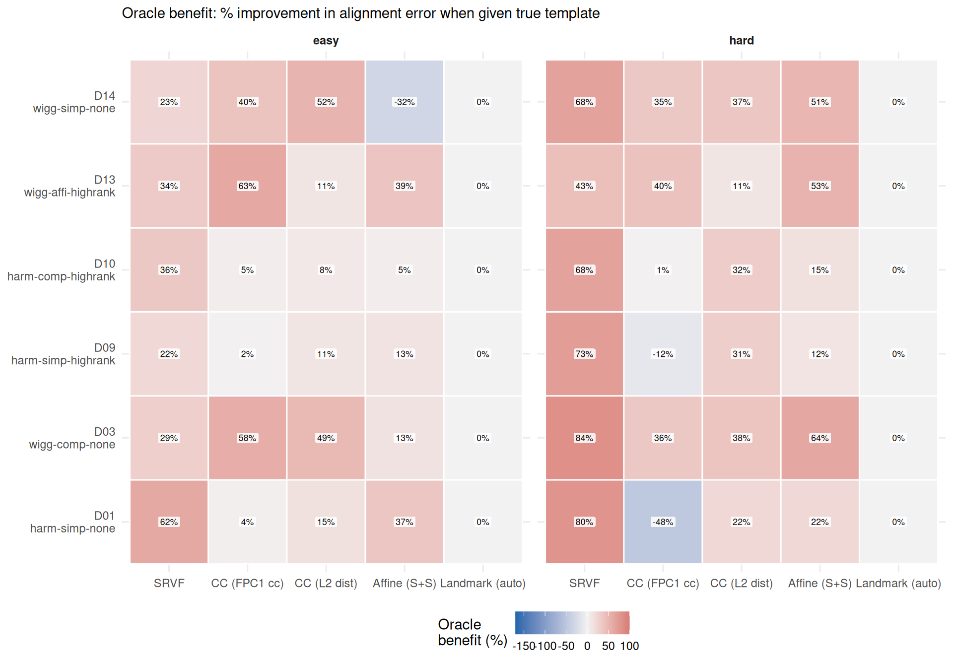 ))SRVF consistently benefits from the true template, with the advantage growing under harder conditions. This is the cleanest evidence that template quality matters for warp recovery.