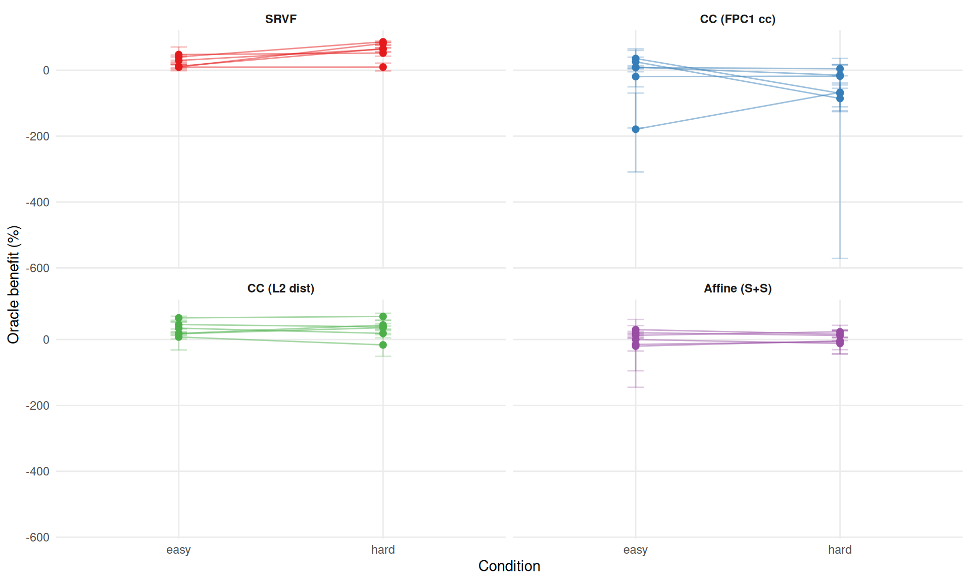 "2. **SRVF benefits most**: Mean oracle benefit %.0f ± %.0f pp (easy) → %.0f ± %.0f pp (hard). ",
