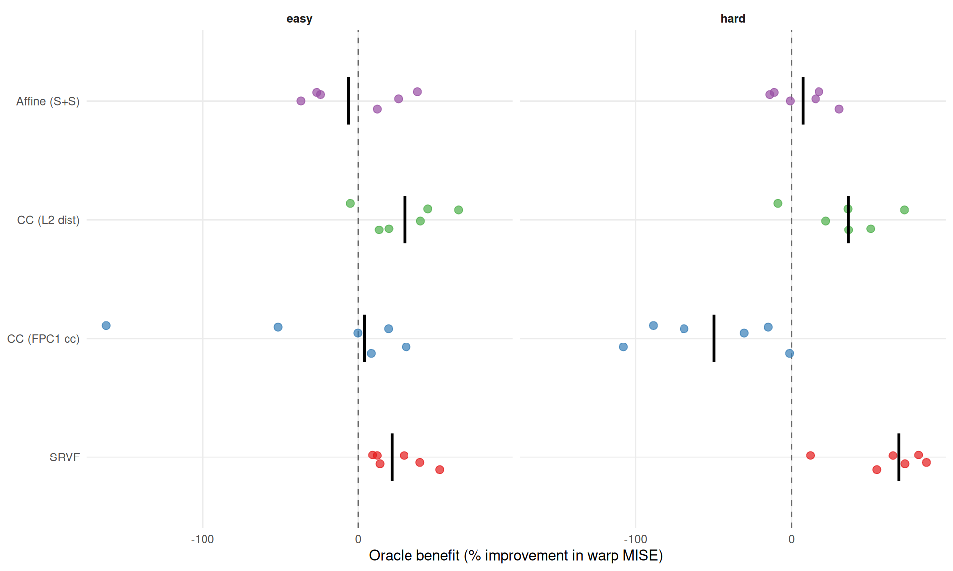 }Key insight — cc_default metric divergence: The warp MISE oracle benefit is negative (estimated pipeline produces better warps due to iterative refinement), but the alignment error oracle benefit is positive. This means the true template partially compensates for the worse oracle-mode warps when computing aligned curves (\(\hat{x}^{\text{aligned}} = \hat{\mu} \circ \hat{h}\)): a perfect template offsets some warp error, while the estimated pipeline’s better warps cannot fully compensate for its worse template. The two metrics thus reveal different facets of the iteration confound (Section 7).