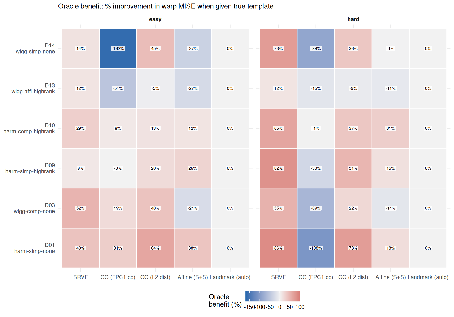 warp MISE oracle benefit is negative. The true template compensates for worse oracle-mode warps when computing aligned curves, revealing that the two metrics capture different aspects of the iteration confound.