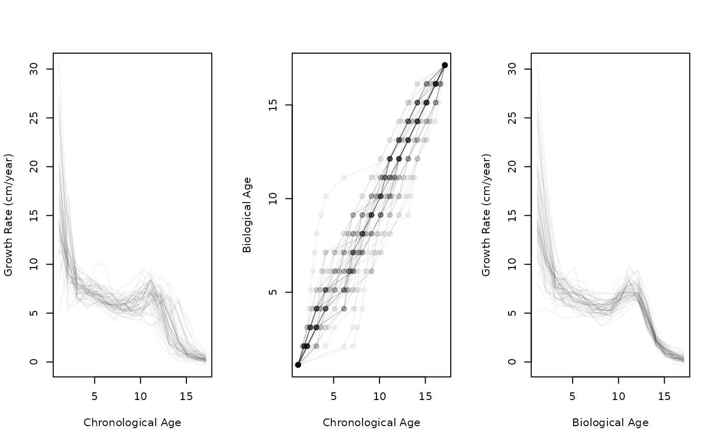 plot(tf_inv_warps(reg), xlab = "Chronological Age", ylab = "Biological Age")