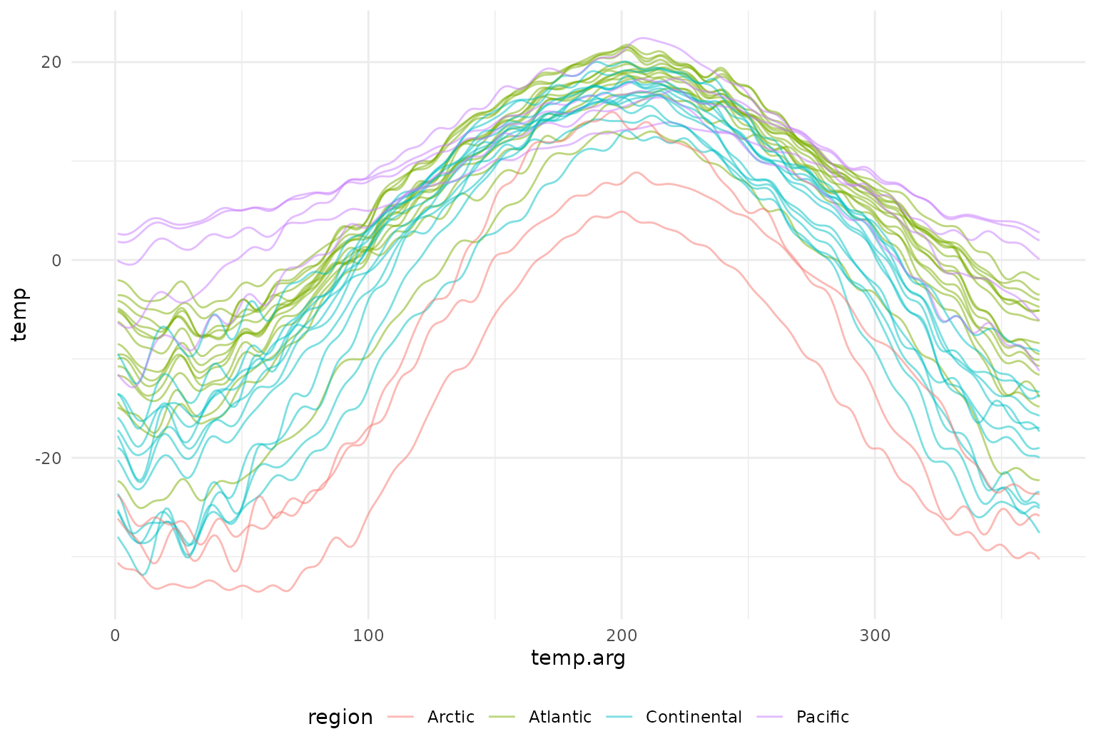 ## # ℹ 1 more variable: precipl10 <tfd_reg>A plot containing both functional observations is shown below.