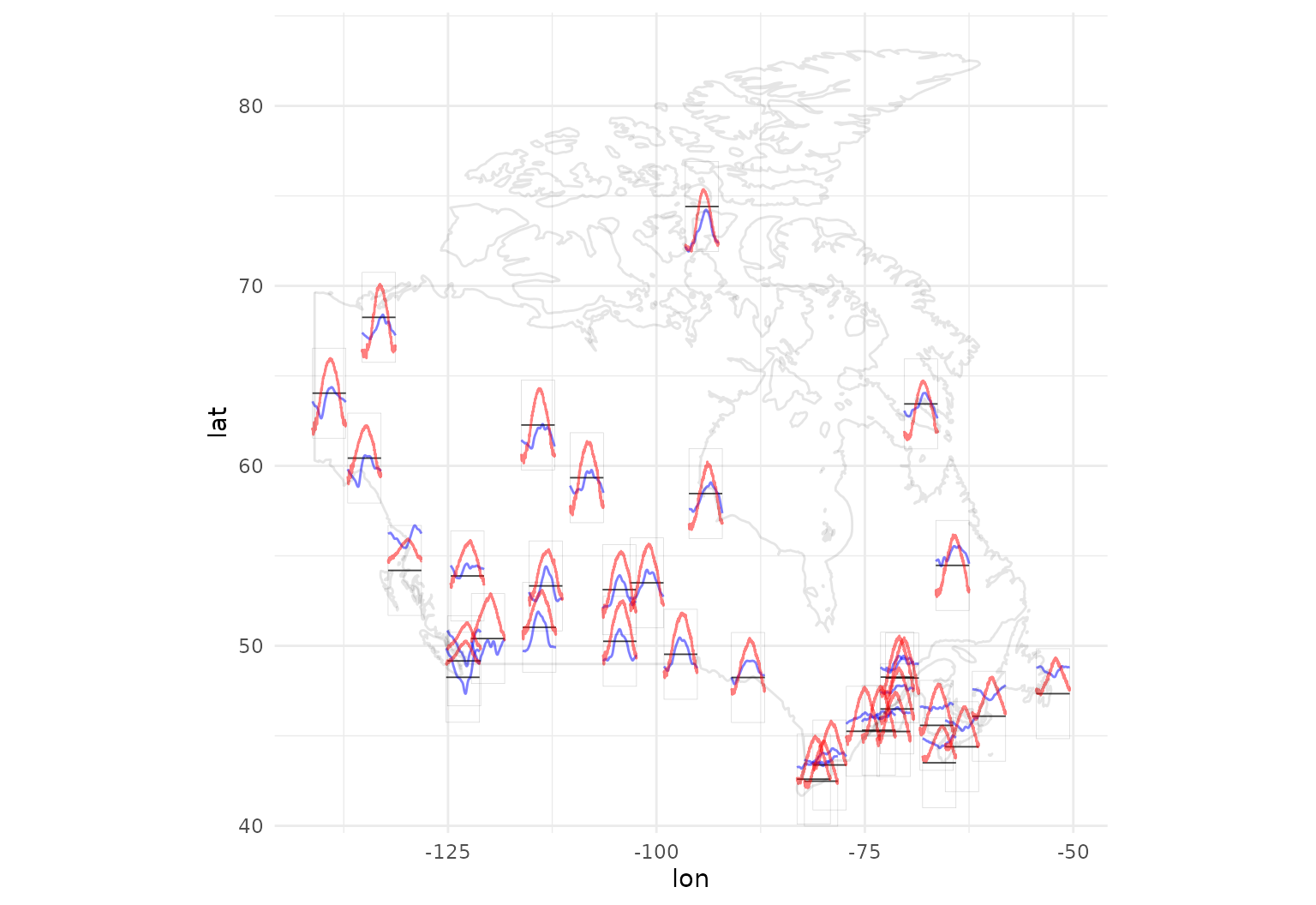 data.frame(maps::map("world", "Canada", plot = FALSE)[c("x", "y")])Now we can plot a map of Canada with annual temperature averages in red, precipitation in blue: