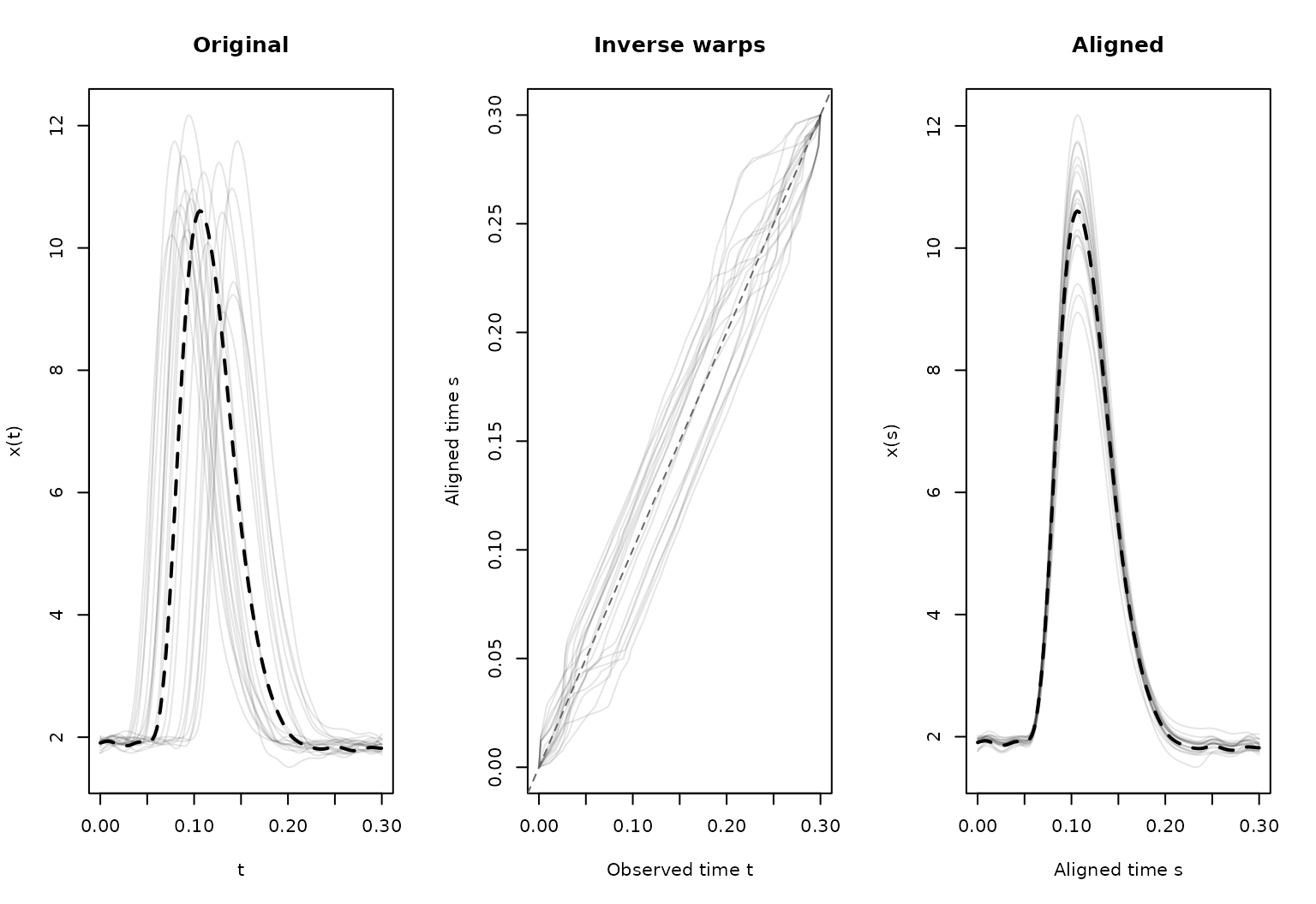 The registered curves, inverse warping functions, and template can also be extracted explicitly for custom plots: